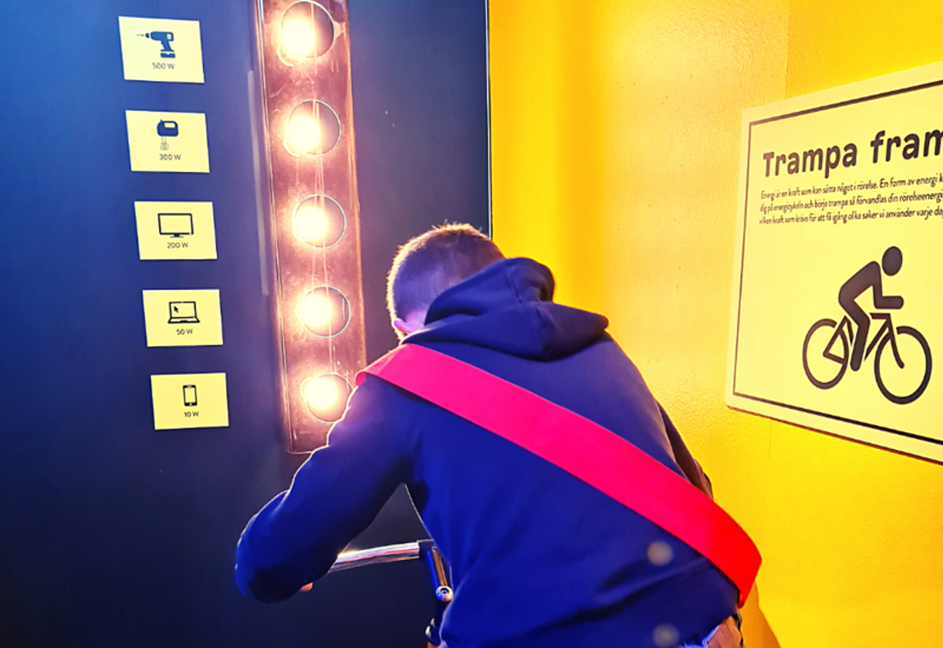 I ett annat dolt rum finns en lite speciell cykel. Här gäller det att trampa så mycket man orkar. Hur mycket rörelseenergi behövs för att driva en tv, ladda en mobiltelefon eller att använda brödrosten?